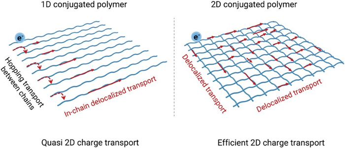 图1 不同导电聚合物结构中电荷的传输途径:图左为一维结构,图右为二维结构(Adv. Mater. 2024, 36, 2311541)
