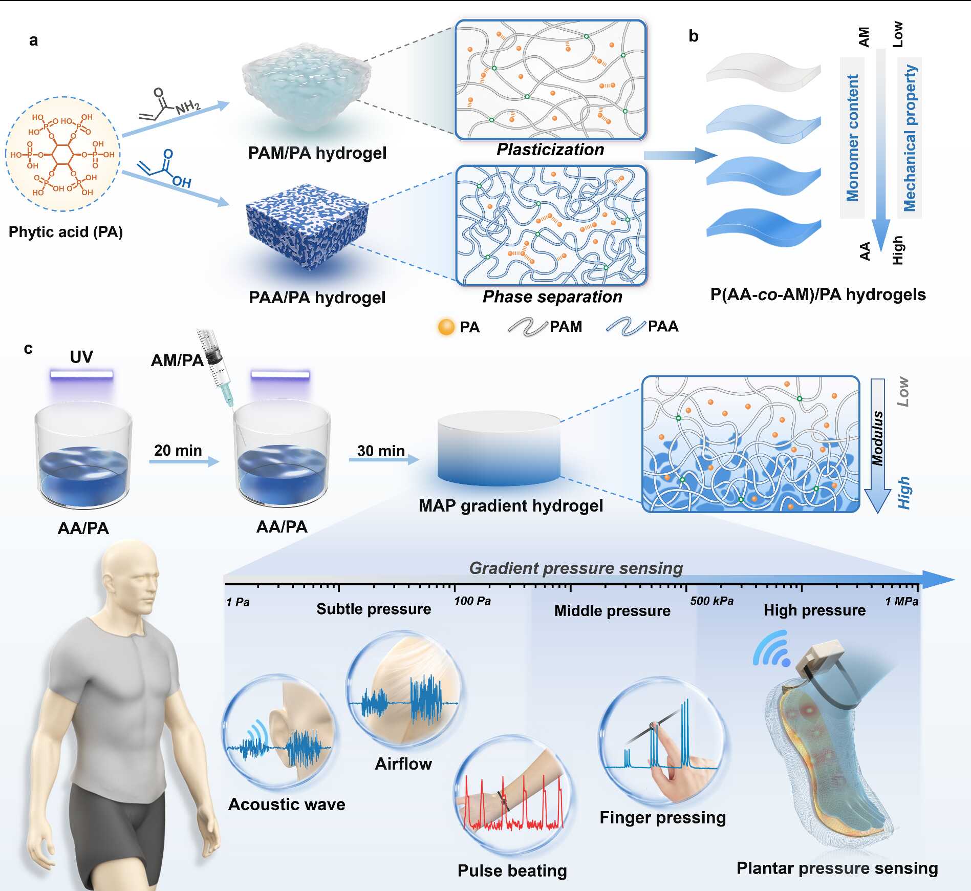 研究人员通过研究植酸(Phytic acid,PA)与水凝胶基质的相互作用,首次发现了植酸与不同聚合物之间存在明显不同的作用方式。在聚丙烯酰胺/植酸(PAM/PA)水凝胶中,PA在PAM网络中表现出明显的增塑作用,增加了PAM分子链的活动能力,显著降低了水凝胶的模量。而在聚丙烯酸/植酸(PAA/PA)水凝胶中,PA促进了PAA的微相分离,其相分离结构显著增强了水凝胶的力学性能。基于上述机理研究,团队通过简便的预聚液浇筑法,将不同植酸-聚合物的水凝胶整体构筑为具有梯度模量的离子导电水凝胶压力传感器。该传感器同时实现了高灵敏度(9.00 kPa-1,<15 kPa)和宽压力检测范围(3.7 Pa ~ 1200 kPa)。值得注意的是,在梯度水凝胶中,富含增塑作用的PAM/PA区域和富含微相分离的PAA/PA区域分别为压力传感器提供了优异的低压检测能力和高压响应性。对于不同频率(100 Hz ~ 6000 Hz)和振幅(70 dB ~ 100 dB)的声波,该水凝胶传感器可以实现灵敏的无接触式响应,对于声音亦可实现特异且可重复的识别。该传感器还可灵敏感知流速低至0.2 m/s的微弱气流。进一步的,对于脉搏、肌肉振动等生理信号,以及压力较大的手指按压,该传感器均可实现灵敏的检测和响应。将该传感器组装制作成无线传输式足底传感阵列,可实现较高压的足底压力分布检测,对于不同的静态站姿和行走时的足底压力变化均具有连续且稳定的响应。此外,PA还赋予了水凝胶优异的抗菌性能和生物相容性,为该压力传感器在生物医学领域的应用奠定了基础。