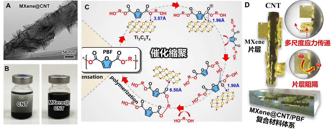 图1 具有多重镶嵌界面的MXene@CNT(A-B)及其催化-强化(C-D)改性高性能PBF生物基塑料