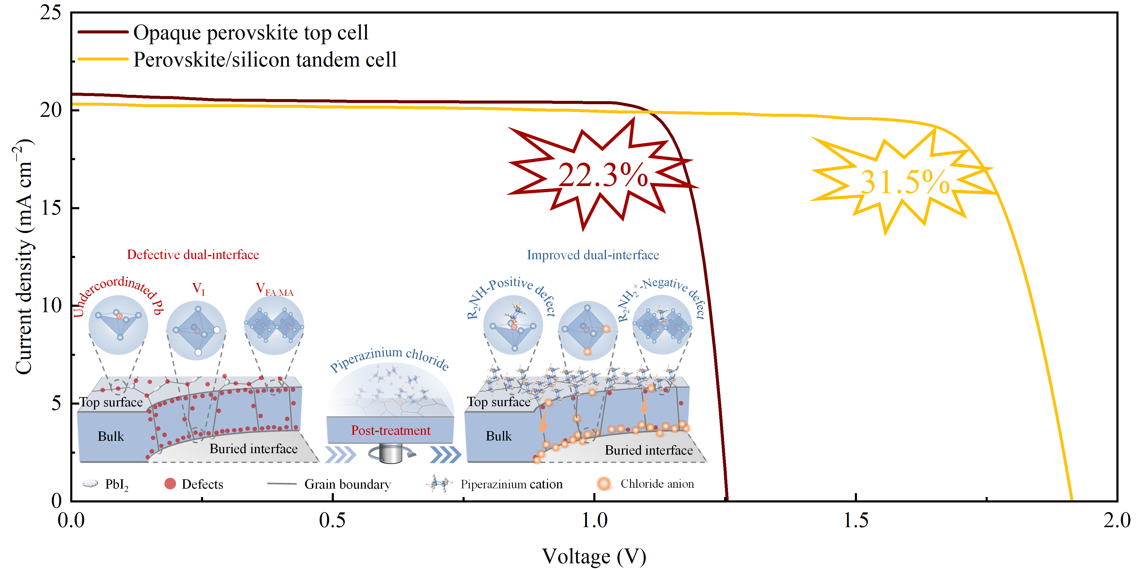 图1 基于自上而下双界面载流子管理策略的钙钛矿单结和钙钛矿/晶硅叠层太阳能电池的J-V曲线。