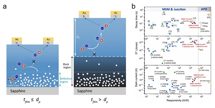 日盲紫外探测器(200-280nm)在森林火灾预警、深空探测等领域具有不可替代的作用。然而,传统硅基器件受限于4.42 eV光子能量阈值,难以实现本征日盲特性,同时还存在暗电流高和热稳定性差等瓶颈。5630福彩网硅基太阳电池及宽禁带半导体团队在叶继春研究员与张文瑞研究员的带领下,以镓系超宽禁带半导体氧化物(Ga2O3和ZnGa2O4)为核心材料,围绕其本征日盲特性和耐极端环境等优势展开攻关,在缺陷调控、器件设计和系统应用方面取得系列研究进展。