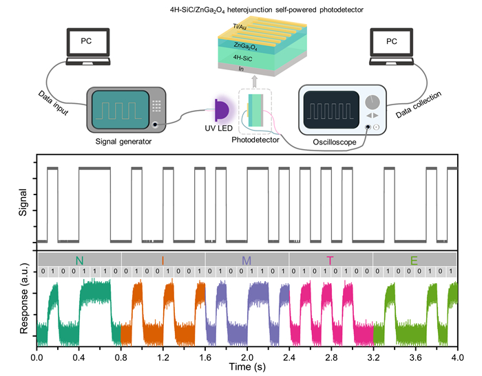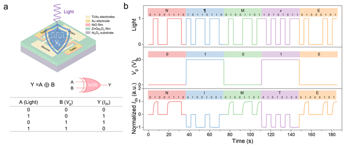 研究团队进一步探索日盲紫外探测器在保密通信中的应用,构建了p-NiO/n-ZnGa2O4异质结场效应晶体管,并发现栅压调控光电流极性切换现象。该器件在0/40 V栅压调控下,光电流实现了34.53 μA/-164.08 μA的可逆切换。基于此特性,团队设计了光电异或逻辑门方案,以栅极电压和日盲紫外光作为输入、漏源电流作为输出。通过调控栅极电压对光信号进行编码,使通信信号被截获,若无正确的加密信号,接收方仍无法解析原始光信息,从而实现信息的动态加密,有效确保数据传输的安全性(如图3),相关成果发表在学术期刊ACS Photonics上(ACS Photonics 2025, DOI: 10.1021/acsphotonics.4c02509)。