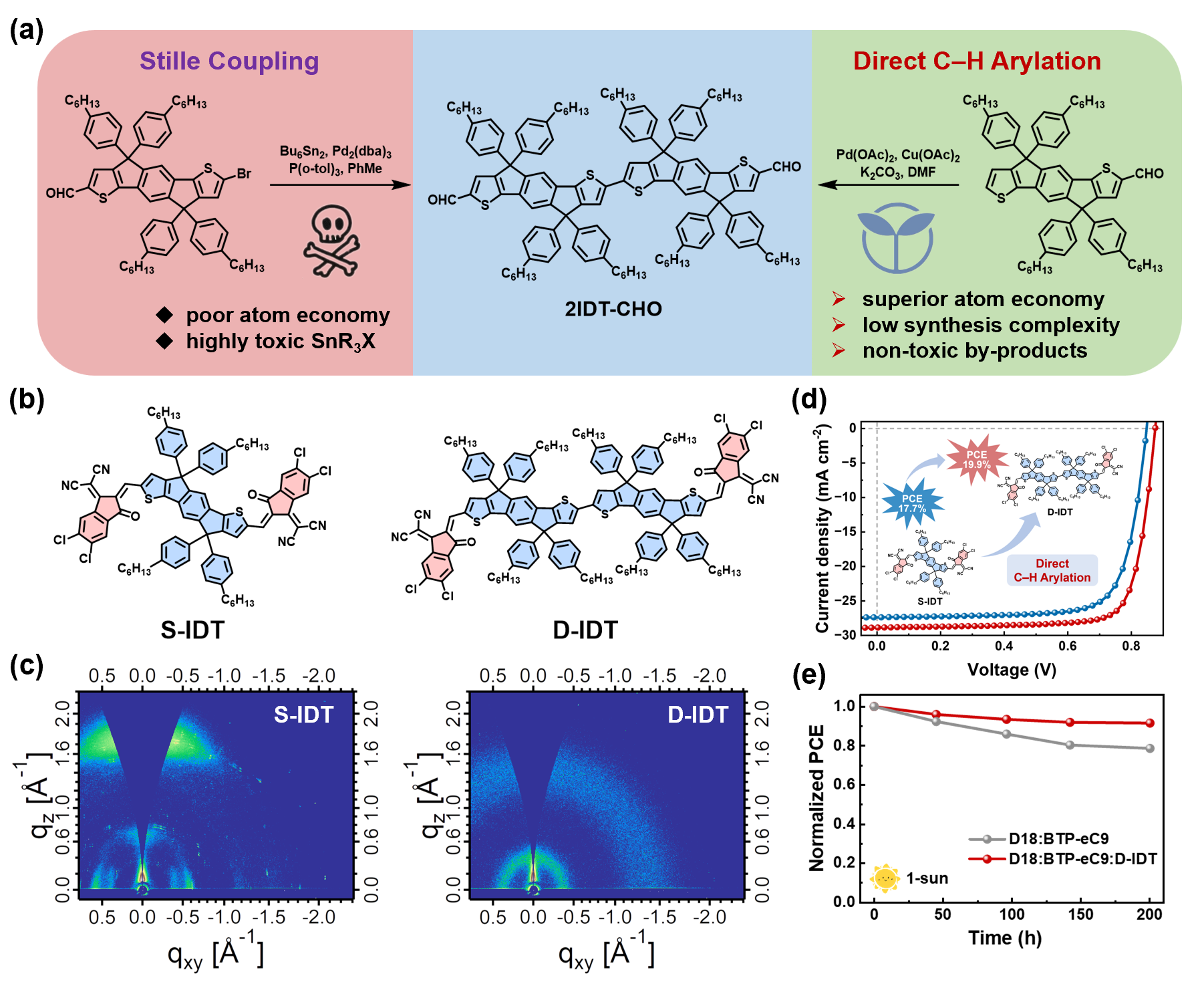 图1(a)直接C-H活化的分子设计策略;(b)S-IDT和D-IDT的化学结构;(c)S-IDT和D-IDT 薄膜的二维GIWAXS图;(d)对应器件的J-V曲线;(e)对应器件的光稳定性