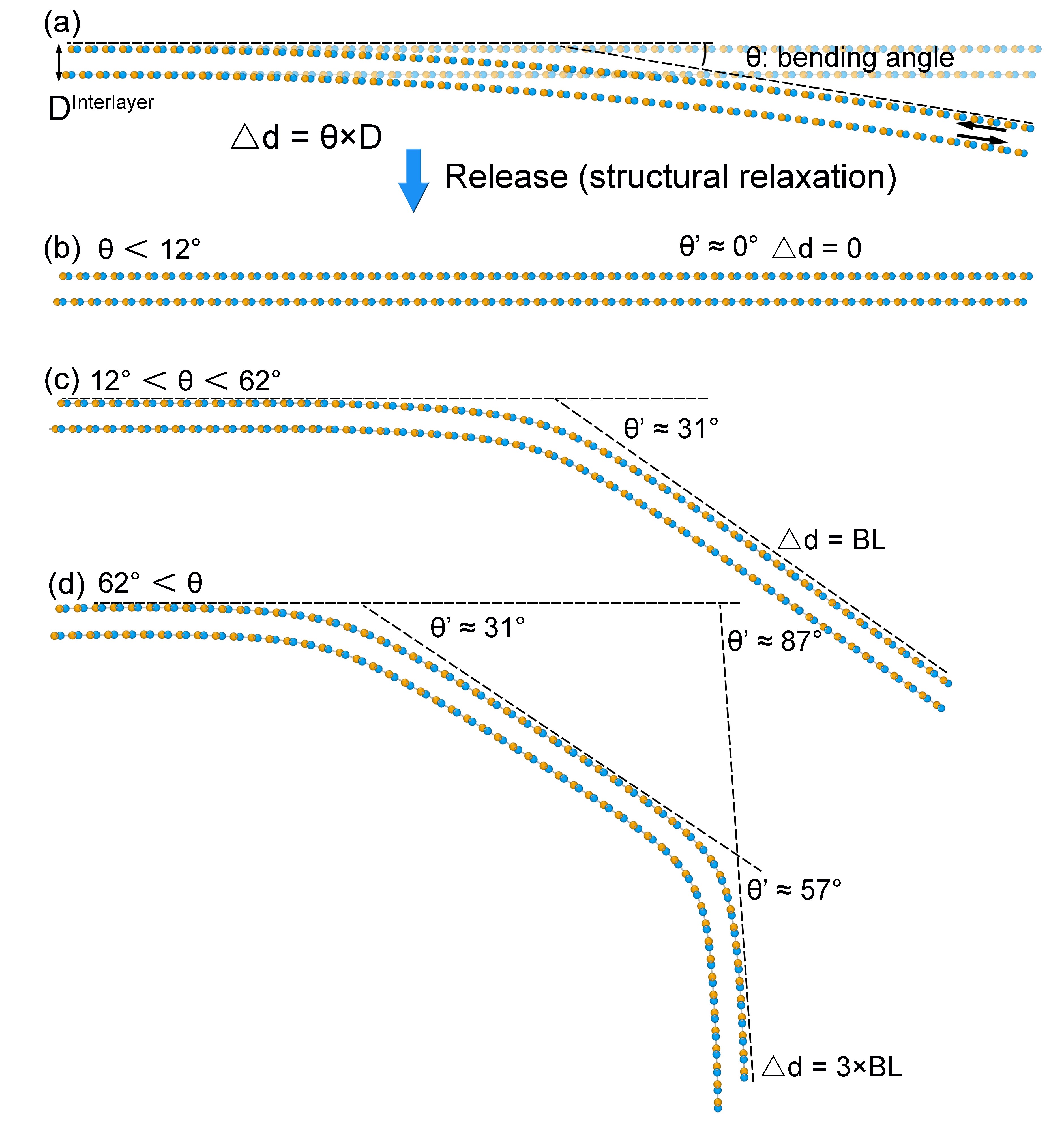 图1 不同弯曲角度下AB畴双层h-BN的原子结构:(a)沿armchair方向弯曲的平面双层结构示意图;(b)–(d)通过深度势能分子动力学弛豫模拟得到的不同初始弯曲角度下的双层原子结构