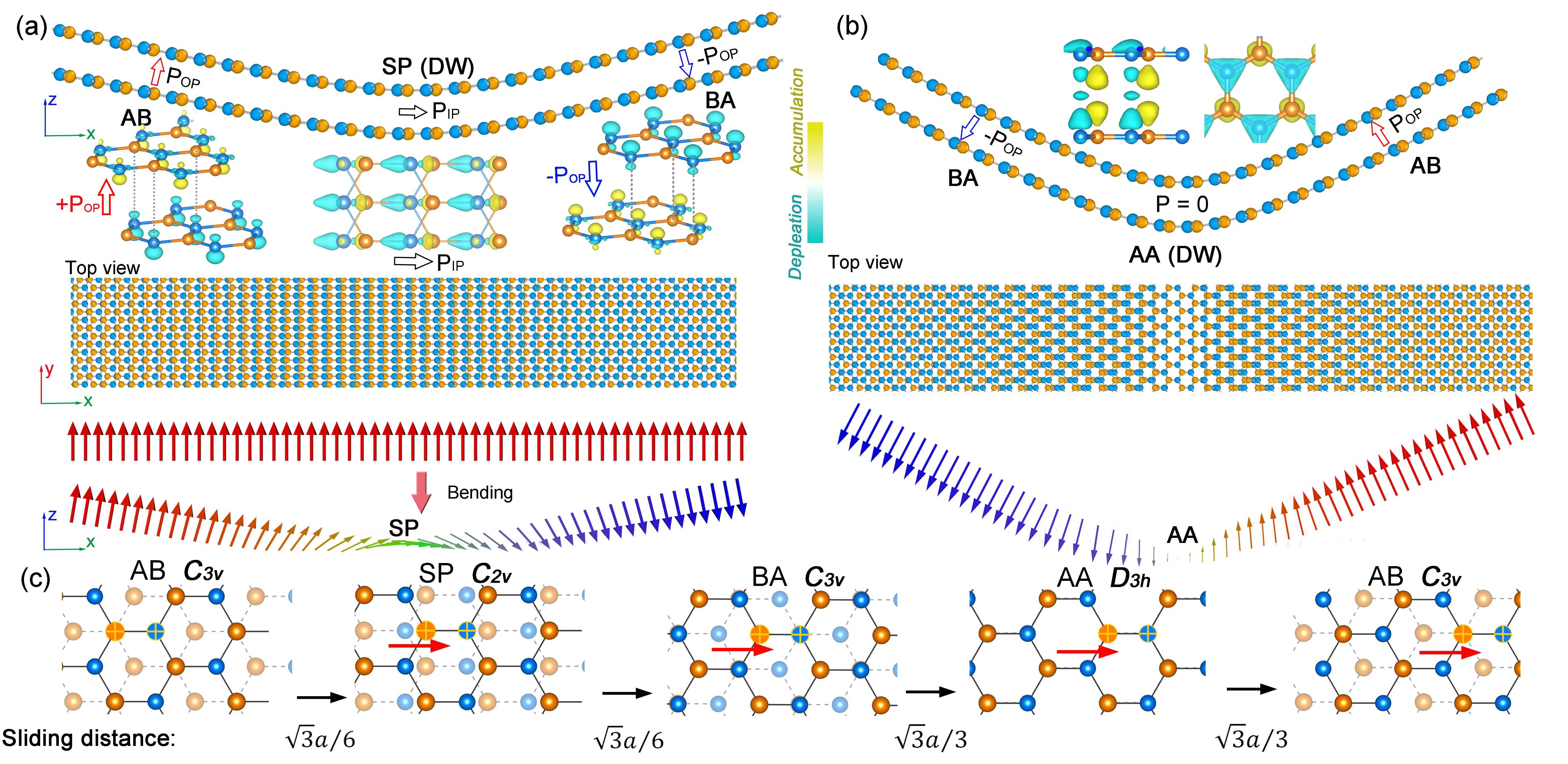 图2 弯曲双层h-BN的原子构型和极化纹理的侧视图与俯视图: (a) 31°褶皱,形成了Néel型畴壁,极化方向从向上平滑旋转到向下; (b) 57°褶皱,形成了Ising型畴壁,畴壁中心的极化消失; (c)弯曲变形中层间滑动引起的AB、SP、BA和AA堆叠构型之间转换的示意图;红色箭头表示滑移方向