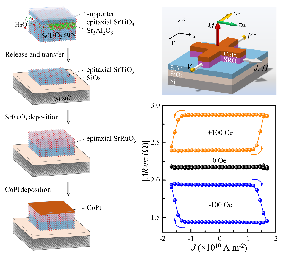 自旋电子器件凭借低功耗、非易失性、超快读写等优势,已成为新一代信息技术的重要发展方向之一。 单晶氧化物自旋霍尔材料因其突出的电荷-自旋转换能力,被认为是开发低功耗自旋器件的理想候选材料。然而,如何实现单晶氧化物自旋霍尔材料与硅基平台的异质集成,仍然面临着巨大挑战。