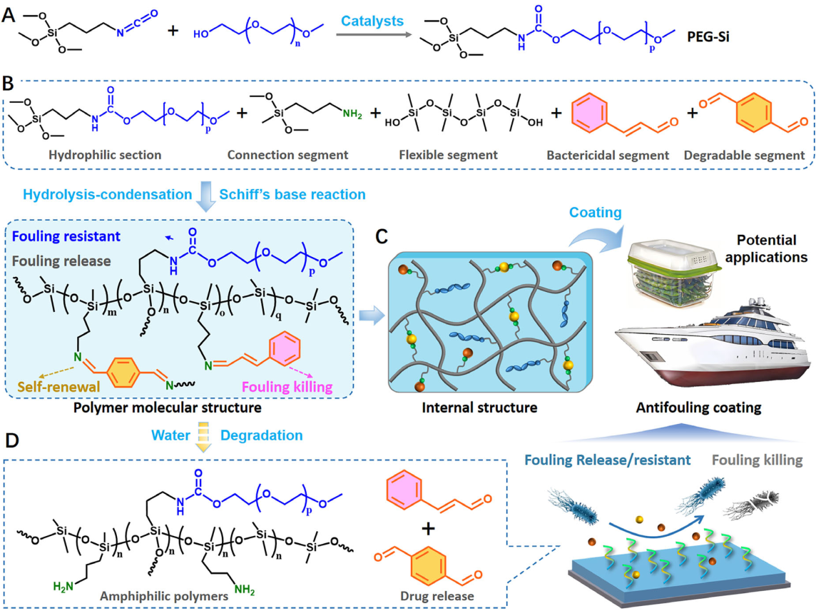 研究人员采用溶胶-凝胶法结合动态席夫碱化学,实现聚乙二醇(PEG)、聚二甲基硅氧烷(PDMS)、对苯二甲醛(TPE)及肉桂醛(CAL)四元体系可控共聚。通过分子链柔性Si-O骨架与动态可逆共价键的协同作用,构建出兼具机械柔韧性、可控降解性及表面自更新能力的智能防污界面。涂层表面的水触发降解可实现TPE与CAL的可控释放,形成持续表面自更新-污损抑制协同效应,两亲性聚合物的原位富集使涂层界面具备污损粘附阻抗与污损释放双重特性。优化涂层可实现98.8%的杀菌率及99.8%的抗生物粘附效率,理论防污寿命可达5.5年(200 μm厚度),展现出高效、长效的防生物污损能力。