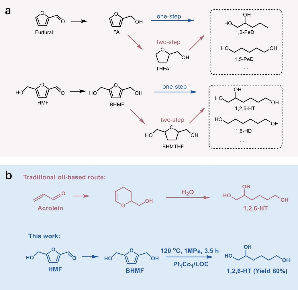 生物质资源的高效综合利用已成为全球绿色可持续发展的重要战略方向。以农业废弃物等可再生原料为基础,合成高附加值化学品的技术路线正持续优化现代化工原料供应体系。作为典型生物质平台化合物,糠醛及其衍生物5-羟甲基糠醛可通过一步法选择性开环反应定向转化为C5-C6链式多元醇。这类多元醇在聚酯合成、表面活性剂、增塑剂及树脂改性等领域应用广泛。该技术路径不仅显著提升了生物质资源利用率,更为化工产业向绿色低碳转型提供了关键支撑。