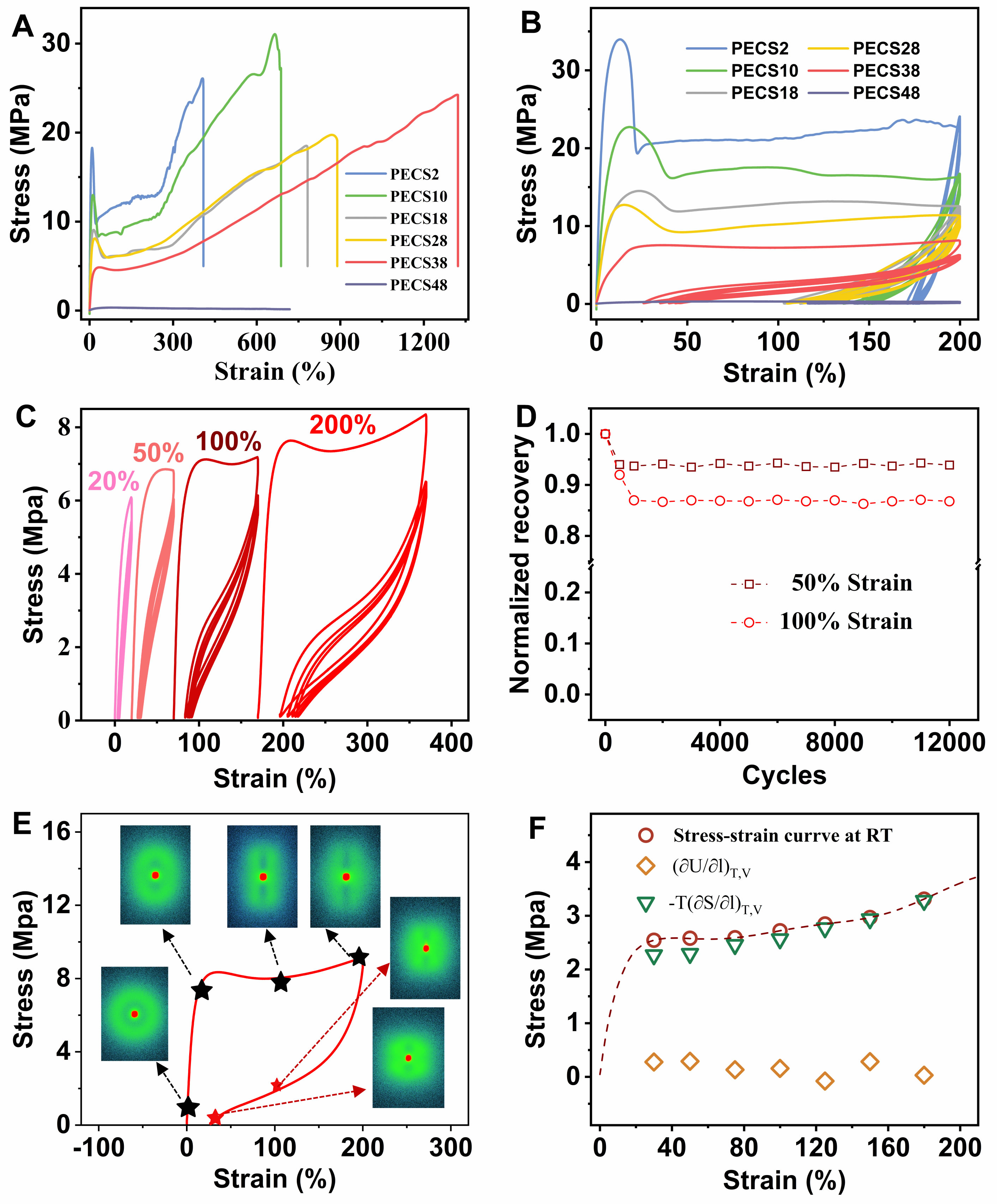 图2. PECS弹性体的机械性能(A-D)、循环拉伸过程聚集态结构演变(E)及弹性来源表征(F)