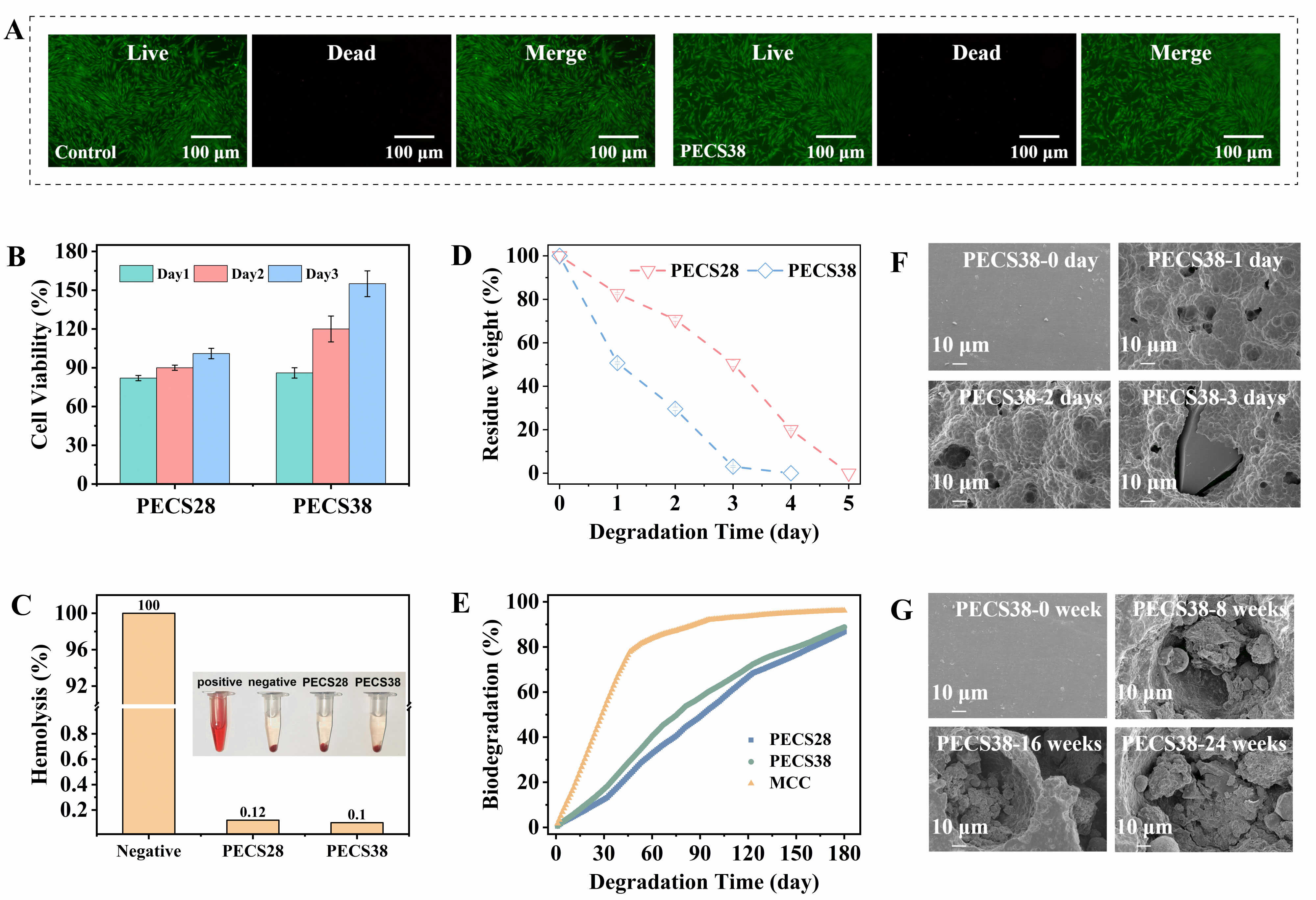 图3. PECS 弹性体的生物相容性(A-C)和生物可降解性(D-G)