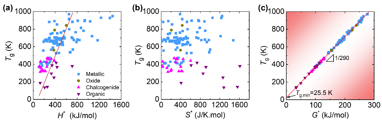 图1. (a)–(c) 玻璃转变的激活焓、激活熵和激活自由能与玻璃转变温度的关系