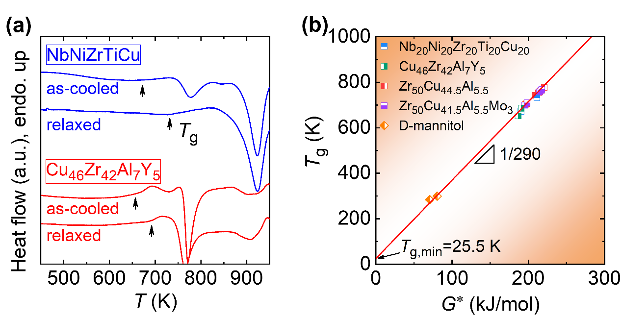 图2. (a) 金属玻璃的热流曲线;(b) 激活自由能和玻璃转变温度的关系