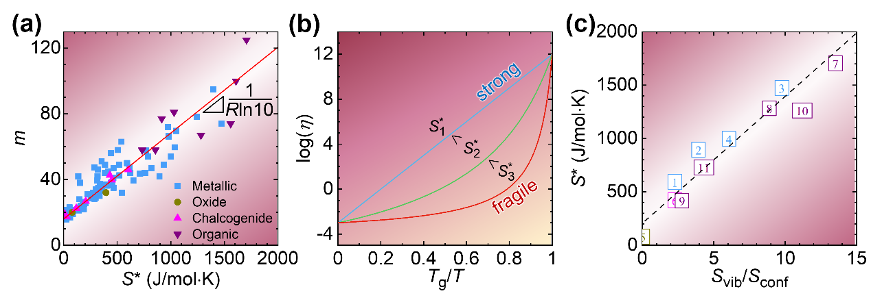 图3. (a) 玻璃转变的激活熵与脆度的关系;(b) 激活熵对强脆转变影响Angell图;(c) 玻璃转变的振动熵/构型熵比值与激活熵的关联