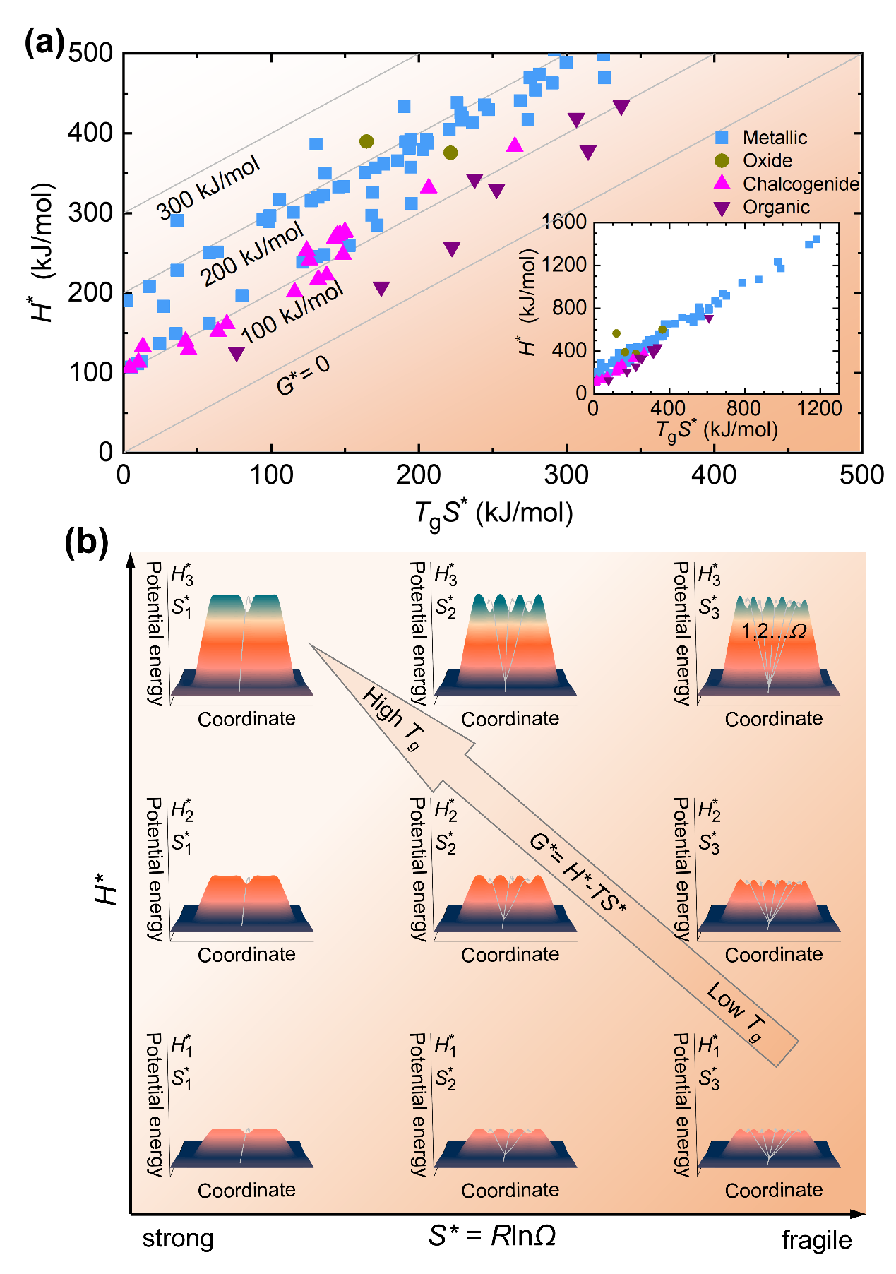 图4. (a) 激活焓、激活熵与激活自由能的关系;(b) 能量地形图示意图