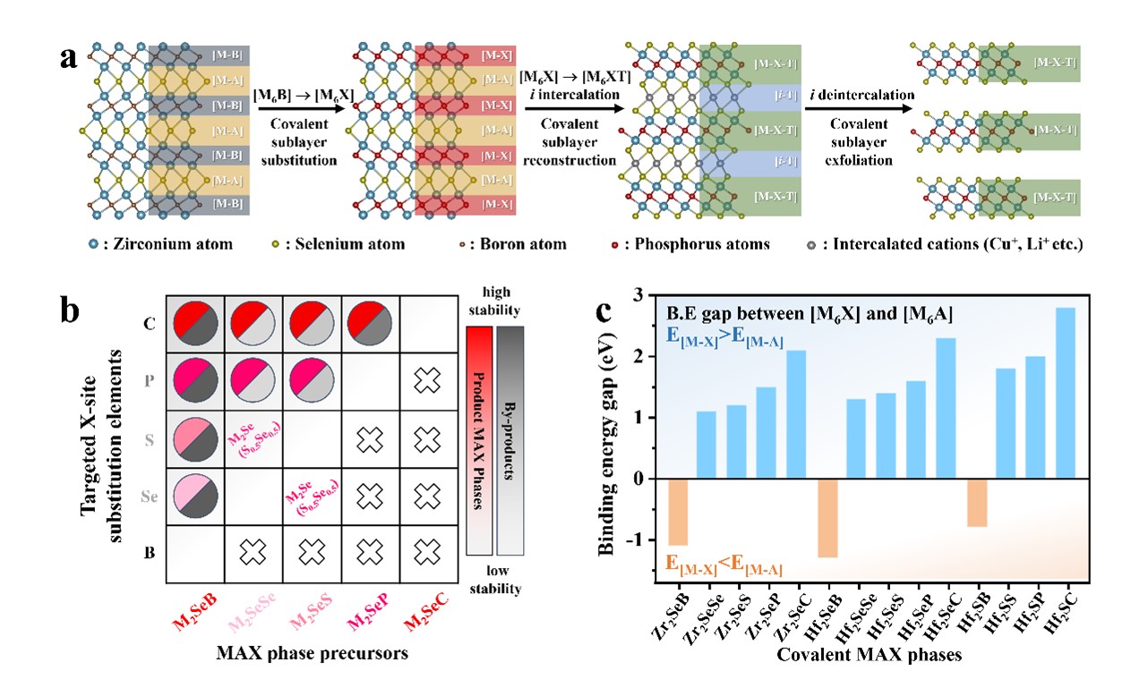 图1 从共价键MAX相到i-TMXC的结构编辑策略(a)共价键硼系MAX相向TMXC二维材料转变的示意图;(b)MAX相内共价键[M-X]亚层取代次序示意图;(c)共价MAX相[M6X]和[M6A]亚层中M元素结合价态的XPS分析,其中X位元素包括B、Se、S、P和C。