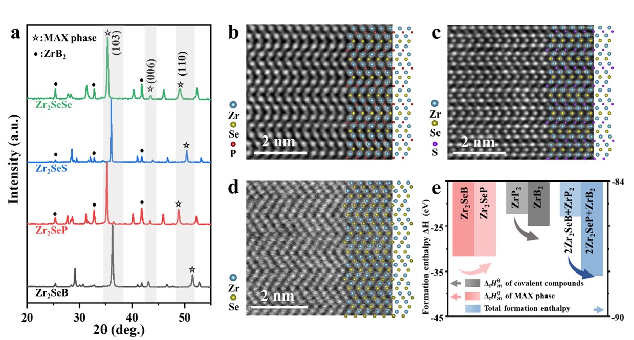 图2. 共价键化学剪刀介导的 MAX 相拓扑化学转化。(a) 母相 (Zr2SeB) 及其衍生MAX相 (Zr22SeP、Zr2SeS 和 Zr2SeSe) 的 XRD 图谱。(b) Zr2SeP、(c) Zr2SeS 和 (d) Zr2SeSe 沿 [110] 晶带轴的STEM 图像及相应的结构模型。(e) Zr2SeB向 Zr2SeP转变过程中反应物和产物的形成焓。