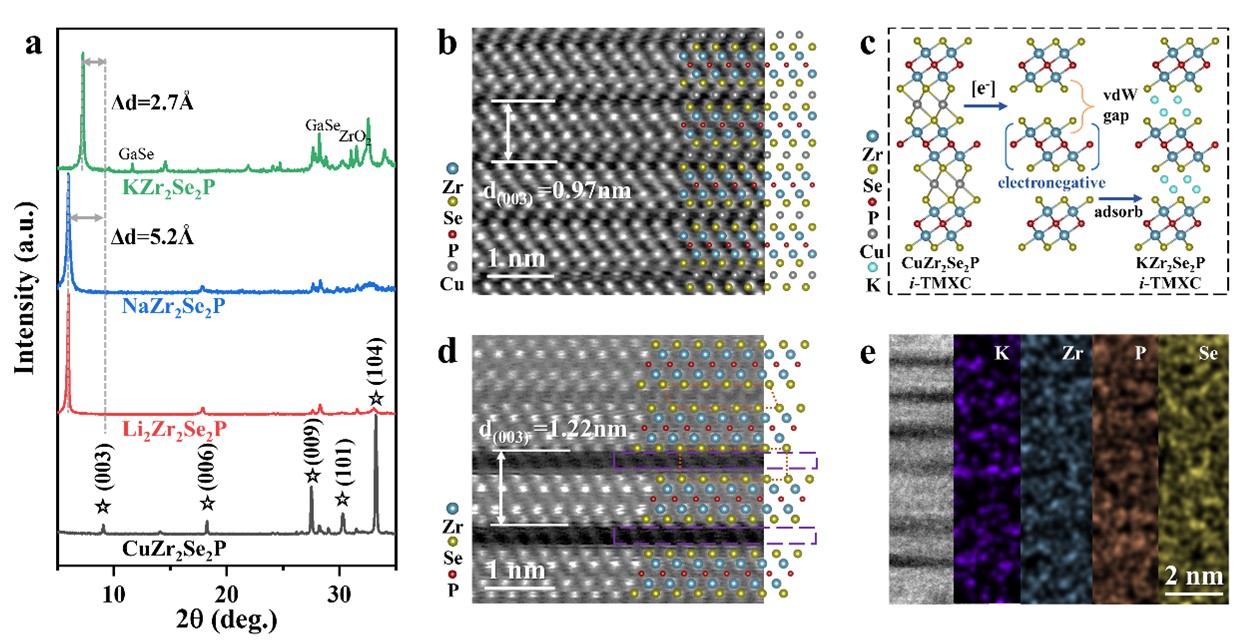 图3. Zr2Se2P 通过插层和离子交换实现的结构演变。(a) 碱金属插层的 Zr2Se2P 及其母相 CuZr2Se2P 的 XRD 图谱。(b) CuZr2Se2P 沿 [110] 晶带轴d 原子排列 STEM 图像。(c) Ga 剪刀介导的 i-TMXC中的插层编辑机制。(d-e) KZr2Se2P沿 [110] 晶带轴的STEM 图像及相应的 EDS 面扫图谱。