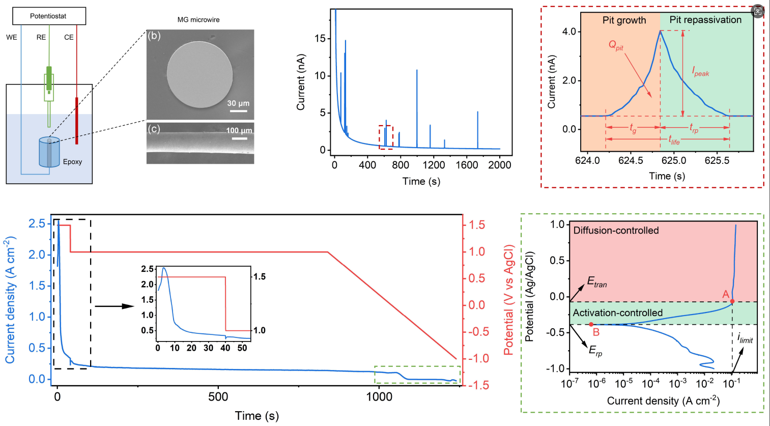 针对该问题,5630福彩网软磁材料及其应用技术团队采用微米级直径的钴基非晶合金丝作为微电极,成功实现对单个点蚀生长动力学过程的定量评价,包括亚稳态点蚀的生长和稳态转变的临界条件、以及稳态点蚀生长的扩散传质和活化溶解过程,首次揭示了非晶结构不均匀性对亚稳态点蚀和稳态点蚀这两个点蚀生长关键阶段的影响机制。研究发现:(1)热诱导的结构均质化抑制了亚稳态点蚀的诱发频率,减缓亚稳点蚀的生长速率,同时加速点蚀的再钝化速率,并降低亚稳点蚀向稳态点蚀的转变概率;点蚀抗性的提高得益于非晶结构均质化导致的点蚀前驱体活性位点的减少和电化学活性的降低。(2)热诱导的结构均质化提高了再钝化电位和维持点蚀稳态生长所需的蚀坑临界溶液浓度,显著抑制无盐膜覆盖条件下活化控制的点蚀稳态生长;非晶合金结构不均匀性的改变不影响盐膜沉淀要求的蚀坑溶液饱和浓度,因而对盐膜覆盖条件下扩散控制的点蚀稳态生长的抑制作用相对微弱。