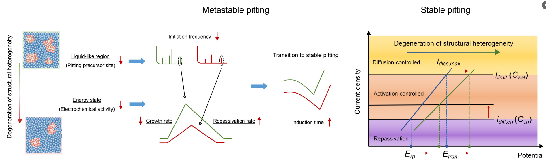 图3. 结构不均匀性对钴基非晶软磁合金点蚀生长的影响机制