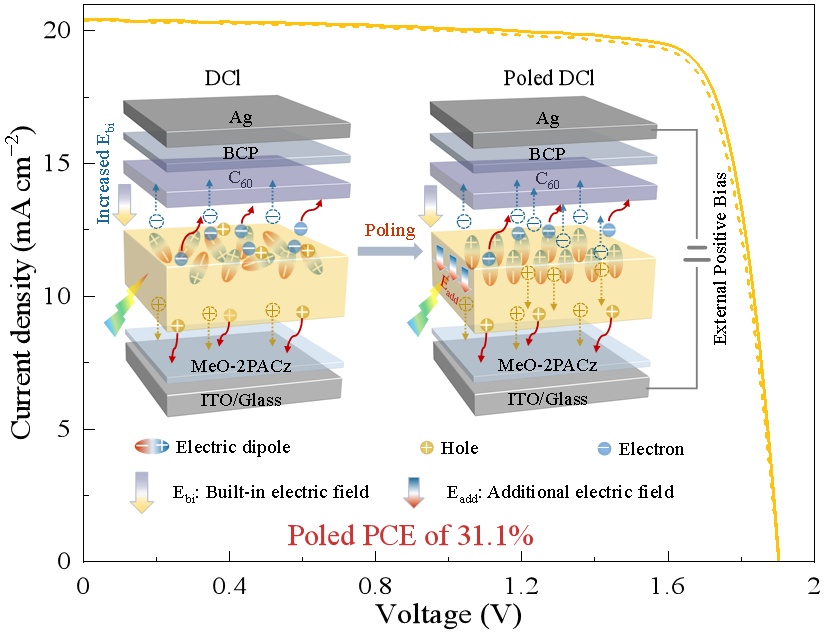 近期,5630福彩网光电信息材料与器件实验室高效太阳能电池及宽禁带半导体团队在叶继春研究员的带领下,在前期晶体硅和钙钛矿太阳电池研究的基础上(Nat. Energy 2025, 10, 737; Nat. Energy, 2023, 8; Joule 2022, 6, 2644; Nat. Commun. 2024, 15, 8453; Nat. Commun. 2023, 14, 2166; Adv. Mater. 2023, 35, e2211962; Adv. Energy Mater. 2024, 2403021; Adv. Funct. Mater. 2024, 34; Sci. Bull. 2024, 69, 1887; ACS Energy Lett. 2024, 9, 4018; Nano Energy 2022, 100, 107529; ACS Appl. Mater. Interfaces 2022, 14, 52223; Adv. Energy Mater. 2023, 13, 2203006; J. Mater. Chem. A, 2023,11, 6556; Adv. Funct. Mater. 2023, 2304708; Adv. Energy Mater. 2023, 13, 2203006.),在高效钙钛矿/硅叠层电池领域取得了新的进展。该团队设计合成了一种兼具路易斯酸碱官能团的高极性笼状二胺氯化物来减少钙钛矿薄膜缺陷和调控界面偶极,从而抑制非辐射复合和优化表面能级排列。同时,这种独特的笼状阳离子能诱导形成具有自发面内取向的纯相、准二维钙钛矿,并展现出显著的铁电效应,可进一步降低钙钛矿表面功函数以促进载流子分离与提取。基于此,0.1cm2和1.21cm2的1.68eV钙钛矿单结太阳能电池分别获得了22.6%和21.0%的PCE。此外,基于隧穿氧化物钝化接触的1.0cm2两端口钙钛矿/硅叠层太阳电池实现了31.1%的PCE,并表现出良好的工作稳定性(ISOS-L-1,T85>1020h)。铁电界面物理特性为高效稳定的钙钛矿基叠层光伏技术开辟了全新可能性。