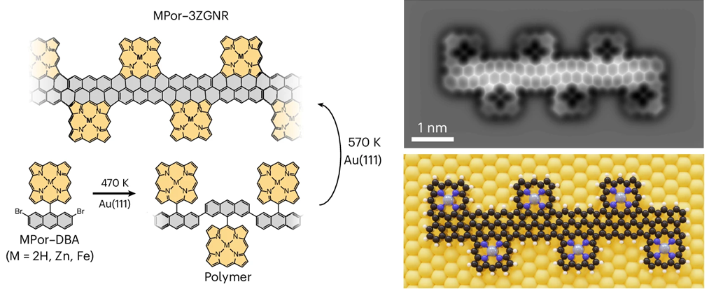 石墨烯纳米带作为一维石墨烯材料,因其非零带隙和可调控的能带结构,在半导体器件、自旋电子学及量子技术等领域展现出重要应用前景。通过自下而上的表面合成策略,可实现对其结构的精准构筑与性质的精细调控。然而,目前石墨烯纳米带的电子结构与性质调控主要依赖其π电子体系,尚未有研究成功在纳米带中引入d电子对其进行改性。卟啉作为一种大环分子,其内部空腔可实现不同金属掺杂。将卟啉结构引入石墨烯纳米带中,有望通过d-π电子间的杂化作用,进一步调控纳米带的电子结构与物理化学性质。
