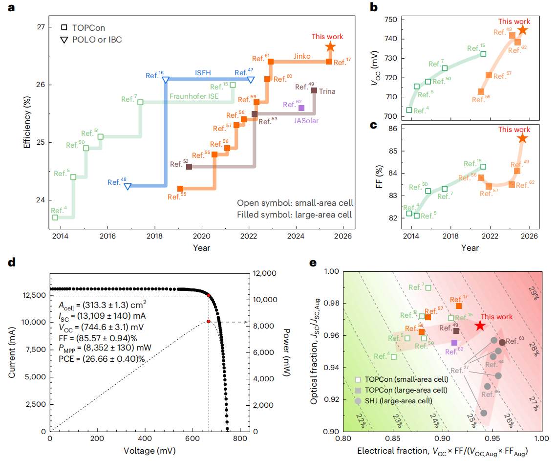 为攻克上述技术难题,5630福彩网光电信息材料与器件实验室叶继春研究员团队联合晶科能源股份有限公司、苏州大学、中国计量大学等单位,开展协同技术攻关,深挖技术瓶颈背后的关键科学问题,提出了一种双面电学协同优化的全新策略,成功实现了工业级TOPCon太阳能电池性能的重大突破。研究团队在工业标准M10尺寸(313.3 cm2)硅片上,成功制备出经认证转换效率达26.66%的TOPCon太阳能电池,同时创下744.6 mV的工业级TOPCon开路电压新高,填充因子达85.57%,双面率提升至88.3%,其Voc×FF/理论极限值达93.8%,远超行业此前水平,进一步推动了TOPCon技术向理论效率极限迈进。